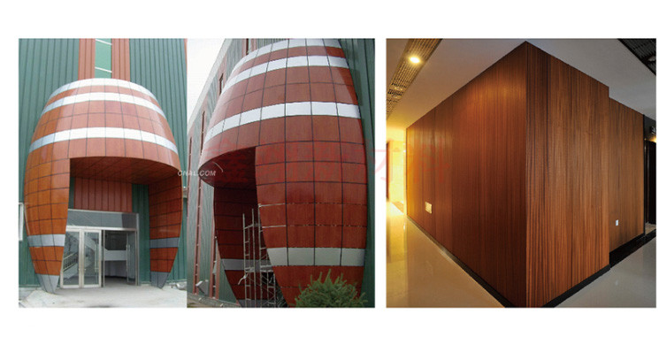 木紋紋理不僅能在平面鋁板上應(yīng)用,在特殊造型鋁板上也能適用。其紋理色彩豐富,自然逼真。提高了外觀裝飾效果及使用價值,美化了建筑空間環(huán)境,為設(shè)計提供了更為廣闊的構(gòu)思空間,創(chuàng)造出獨特美觀的作品。